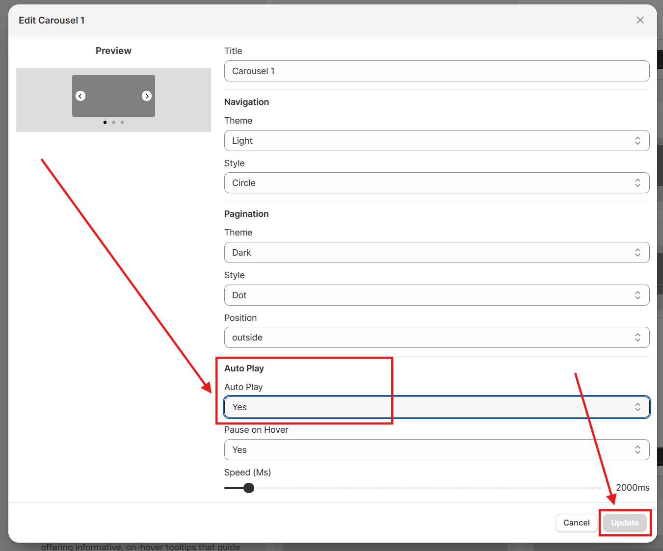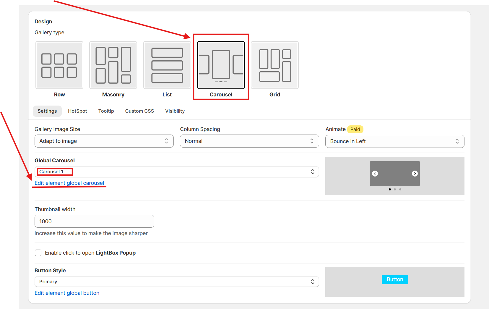 From your gallery settings page, in the Design section, click Edit element global carousel.