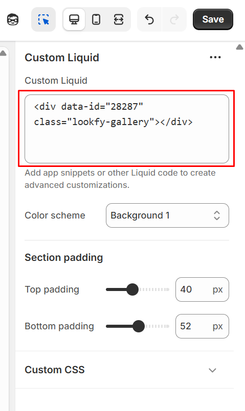 It is a fairly popular problem because there are some stores still using the liquid themes. This kind of theme does not support to add Lookfy section/block in the theme customizer. Hence, you must find another way to publish your gallery.