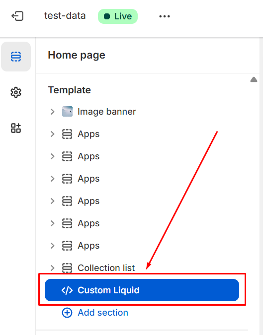 If you cannot find Custom Liquid in the section list, please refer to create Custom Liquid section in Shopify